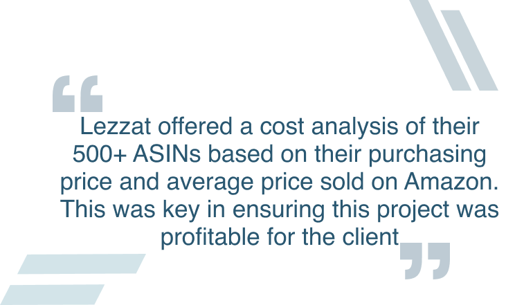 When selling under other listings on Amazon, it is important to have a solid pricing strategy in order to win the buy box and start building revenue. A combination of industry leading tools and inventory forecasting enabled the Lezzat team to advise the client what the minimum and maximum prices should be for their product. That ensured that units sold were done so with the desired margin and ultimately profitability.