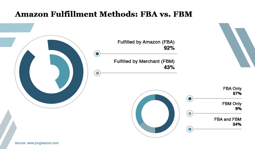 Based on a JungleScout research, almost all Amazon sellers (92%) are using Amazon FBA, and a two out of five (43%) use Amazon FBM as well. Broken out, Amazon sellers sell: